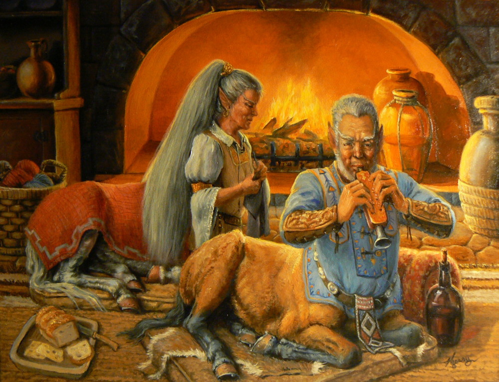 Hi, y'all! I'm back! I have something new...finally! More centaurs! No spring chickens this time, either. Granma and Granpa taurs in a quiet domestic scene where he is relaxing after a long days work, just mellowing out with some wine and music and she is keeping warm by the fire and catching up on some mending. This is a 9x12 oil on hardboard panel.