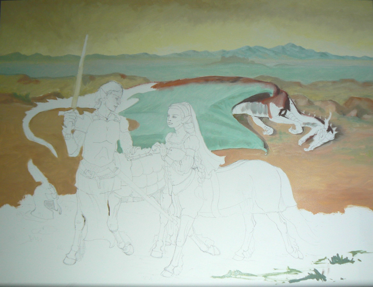 This is a sequence of photos taken of the work in progress on this painting starting with the initial thumbnail sketches to work out ideas and composition, and, with the final finished image above and at the end.